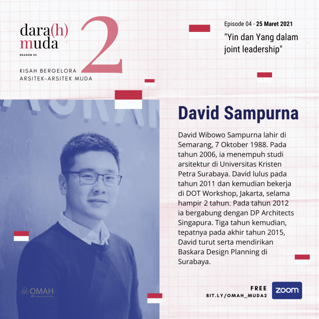 David Wibowo Sampurna lahir di Semarang, 7 Oktober 1988. Pada tahun 2006, ia menempuh studi arsitektur di Universitas Kristen Petra Surabaya. David lulus pada tahun 2011 dan kemudian bekerja di DOT Workshop, Jakarta, selama hampir 2 tahun. Pada tahun 2012 ia bergabung dengan DP Architects Singapura. Tiga tahun kemudian, tepatnya…