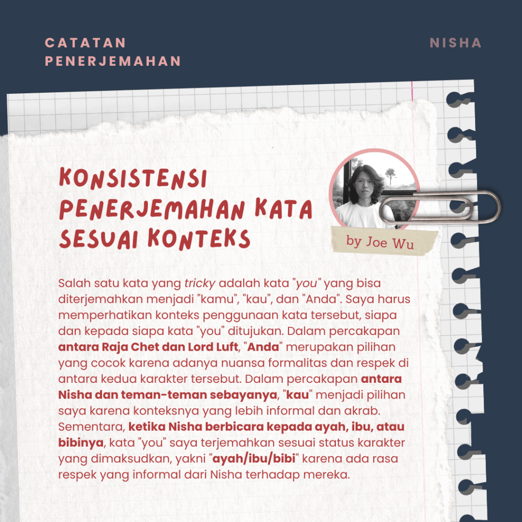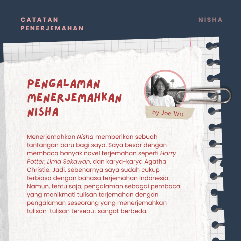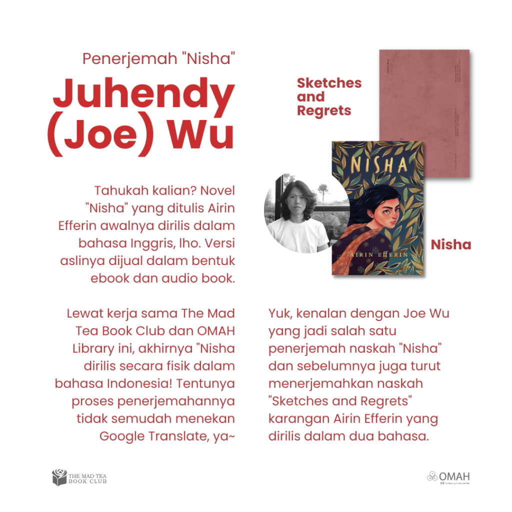 Yuk, kenalan dengan Kak Joe Wu yang jadi salah satu penerjemah naskah “Nisha” dan sebelumnya juga turut menerjemahkan naskah “Sketches and Regrets” karangan Airin Efferin yang dirilis dalam dua bahasa.