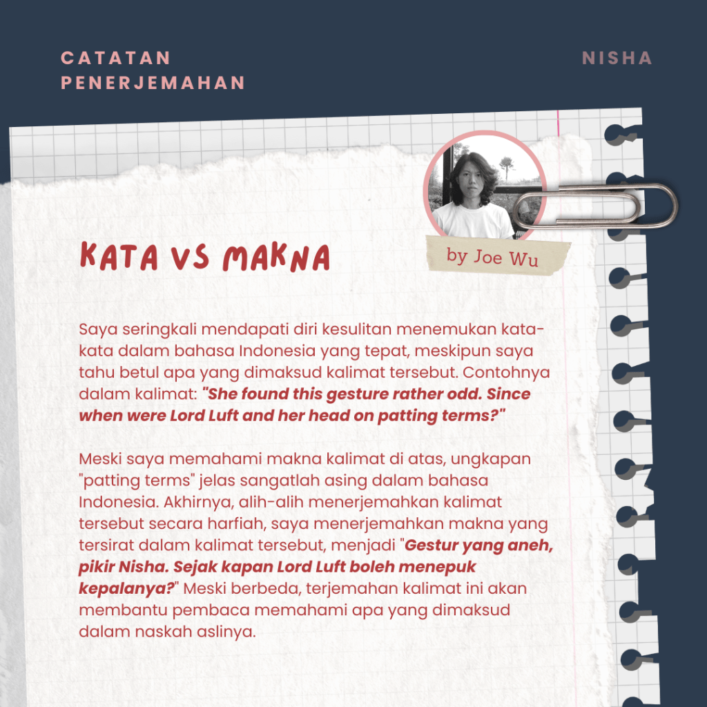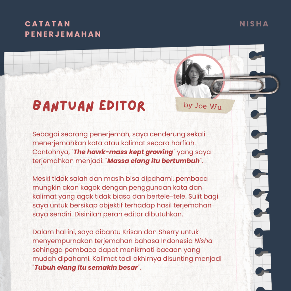 Menurut Kak Joe, ada beberapa poin yang jadi perhatian utamanya saat menerjemahkan “Nisha” yang merupakan naskah fiksi, yaitu makna harfiah vs makna kiasan, konsistensi penerjemahan kata sesuai konteks, dan bagaimana editor membantu membuat hasil terjemahannya lebih luwes dan mudah dipahami.