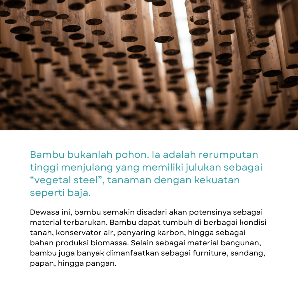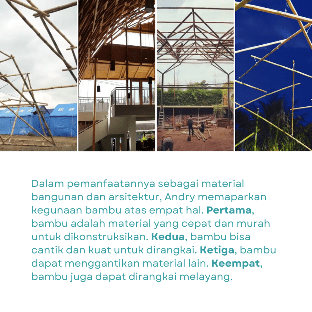 Bambu sangat berguna sejak lama, namun tidak berharga, atau kalaupun dihargai, hanya disematkan kata ‘murah’. Perjalanan ini dimulai dari melihat konstruksi rumah bambu plaster yang dibuat oleh Belanda di masa kolonialisme yang membuatAndry jatuh cinta terhadap bambu di tahun 1999.
