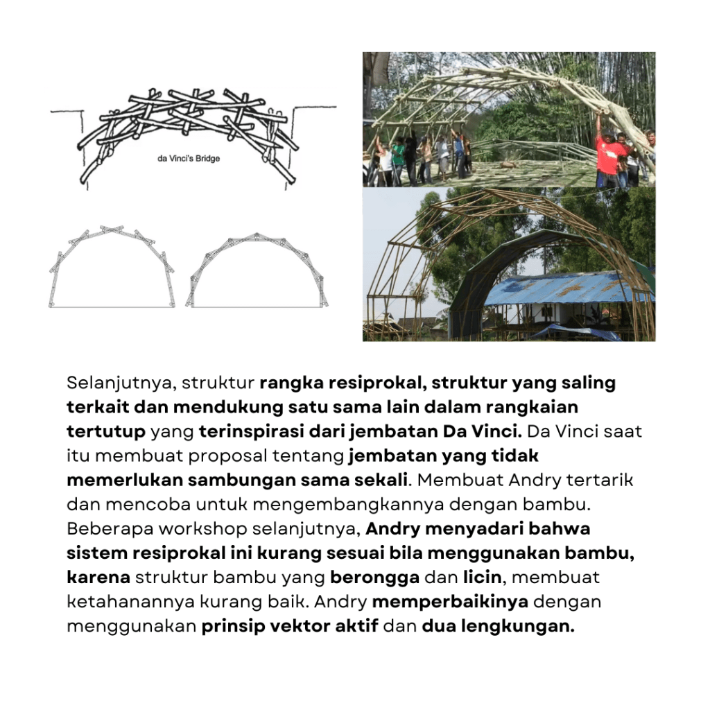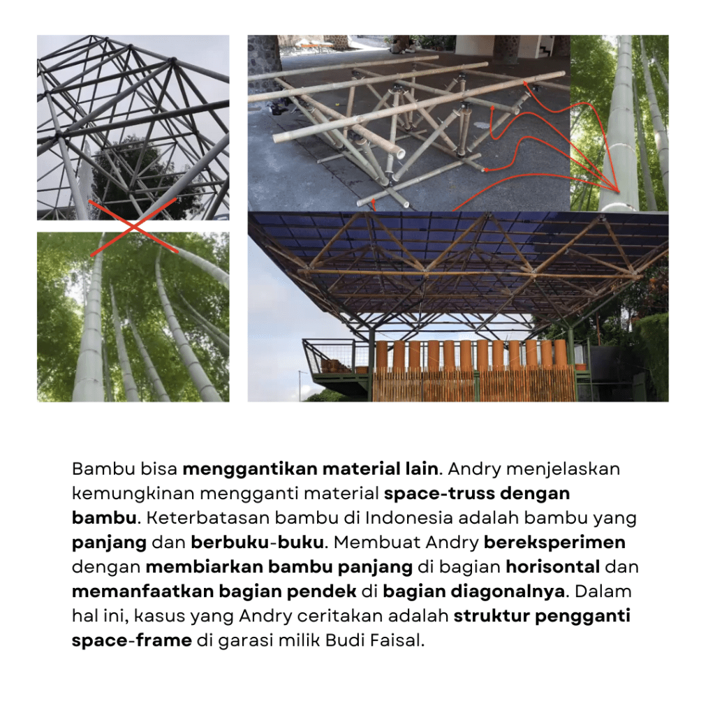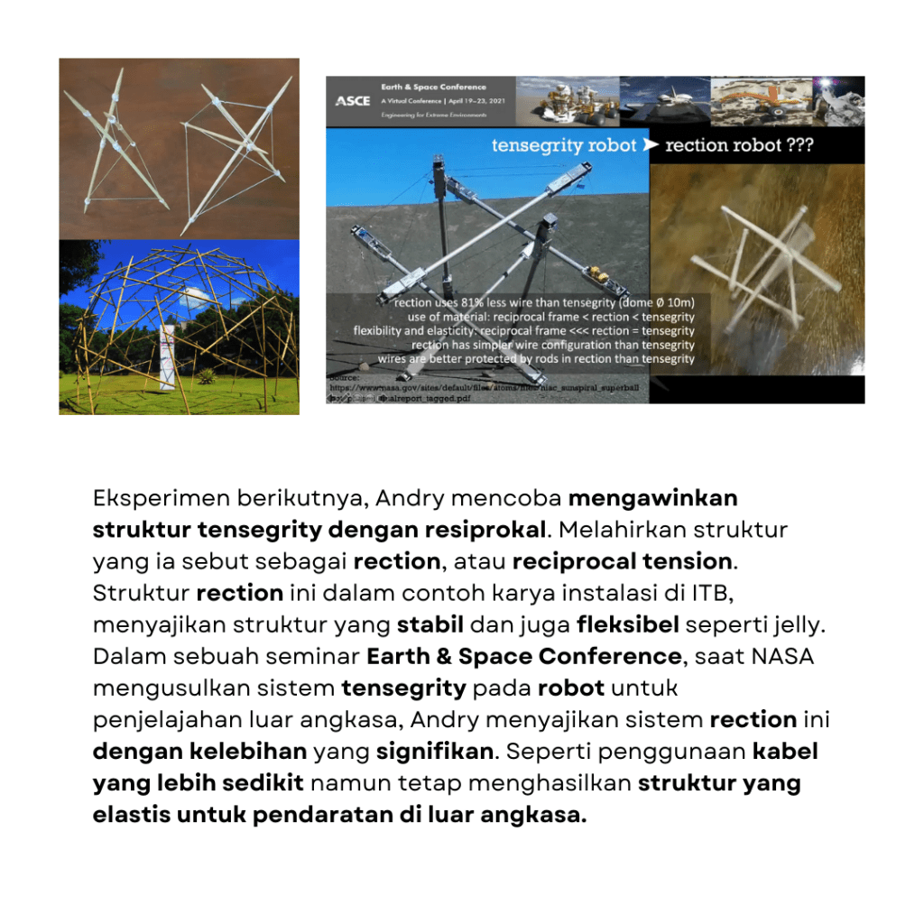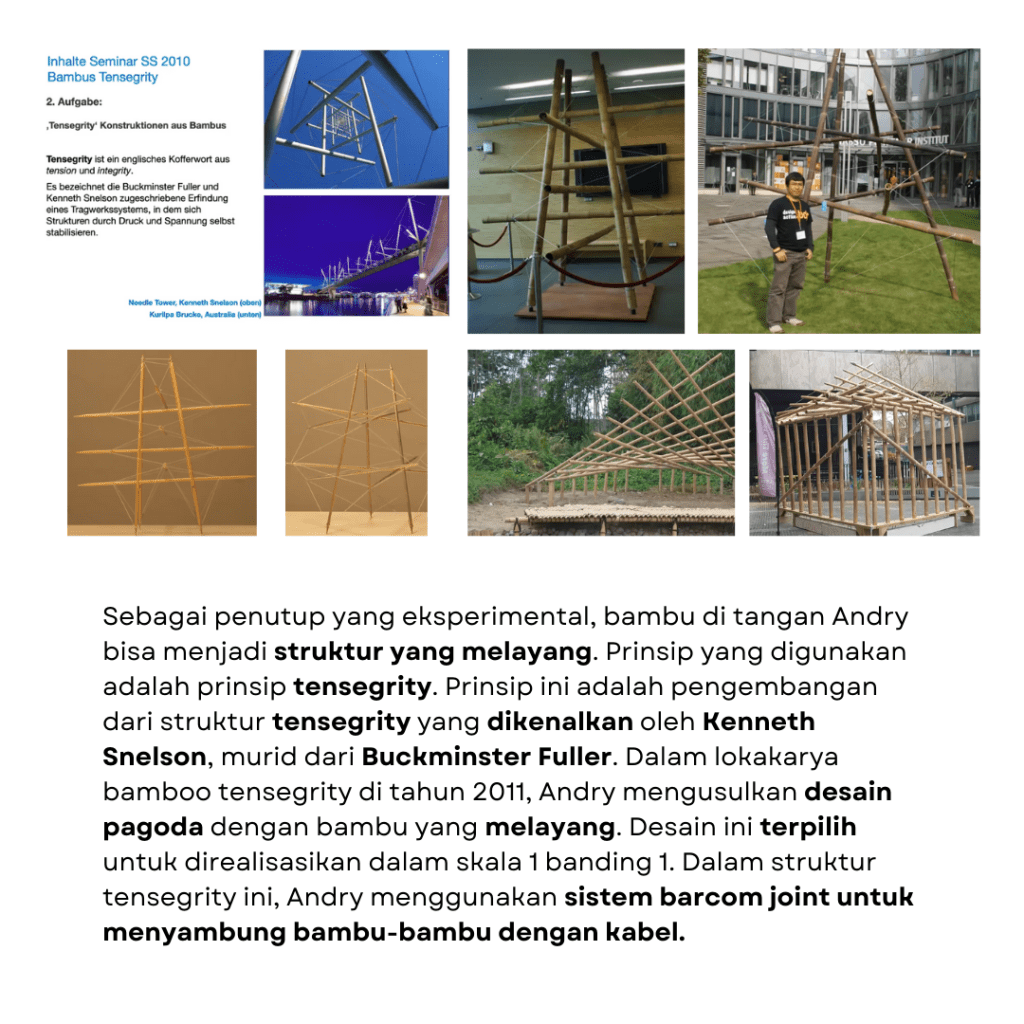 Potensi besar bambu juga dilihat oleh Andry bisa dipakai untuk berbagai sistem struktur yang biasa dikonstruksikan dengan bahan lain, atau dalam klasifikasi Andry masuk dalam kategori ‘substitutive bamboo constructions’. Eksplorasi pemakaian bambu untuk struktur geodesic dome, space frame, reciprocal frame dan tensegrity akan dipresentasikan dilihat dari sudut konstruksi bambu. Pada akhirnya, kelahiran sistem struktur ‘baru’ – rection atau reciprocal tension – akan dipresentasikan sebagai hasil dari penafsiran yang berbeda terhadap tensegrity dan reciprocal frame.