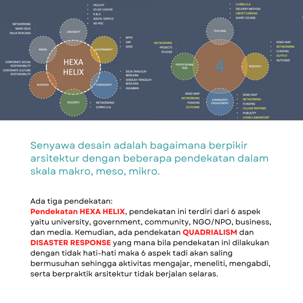 Pendekatan tersebut dilakukan agar 6 aspek (university, government, community, NGO/NPO, business, dan media) ini dapat menjalankan aktivitas mengajar, meneliti, mengabdi, serta berpraktik arsitektur yang selaras.