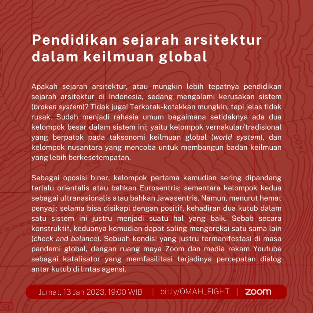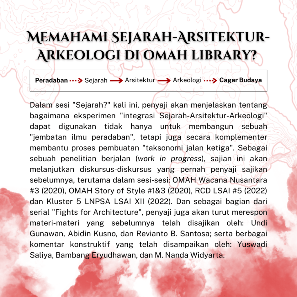 Setelah yang lalu kita bersama-sama telah melalui pergulatan melalui pergerakan dan kearsipan, kali ini giliran kita membahas sejarah arsitektur, atau mungkin lebih tepatnya pendidikan sejarah arsitektur di Indonesia, sejauh mana ia menjembatani kutub-kutub keilmuan yang ada? Antara data artefak (arkeologi) dengan interpretasi (sejarah)?