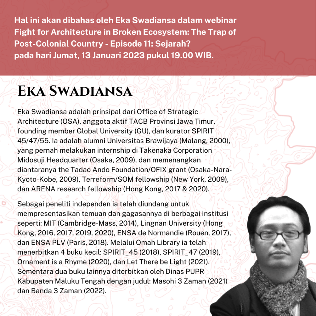 Eka Swadiansa mengajak kita berdiskusi tentang bagaimana kolaborasi antara tiga bidang yang terkotak-kotak, yaitu sejarah, arsitektur, dan arkeologi dapat membantu melahirkan keilmuan dan narasi historis yang lebih utuh dan saling mendukung.