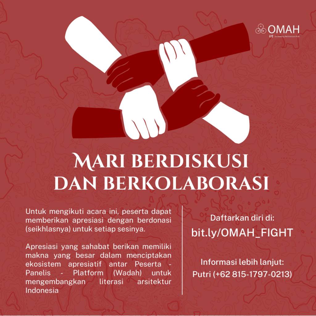 Untuk mengikuti acara ini, peserta dipersilakan untuk memberikan apresiasi dengan berdonasi (seikhlasnya) untuk setiap sesinya. Apresiasi yang sahabat berikan memiliki makna yang besar dalam menciptakan ekosistem apresiatif antara Peserta – Panelis – Platform (Wadah) untuk pengembangan literasi arsitektur Indonesia.