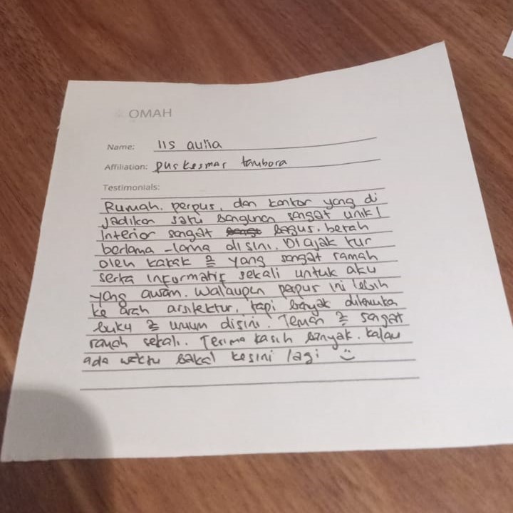 Rumah, perpus, dan kantor yang di jadikan satu bangunan sangat unik ! interior sangat bagus, betah berlama-lama di sini. Diajak tur oleh kakak-kakak yang sangat ramah serta informatif sekali untuk aku yang awam. Walaupun perpus ini lebih ke arah arsitektur, tapi banyak ditemukan buku-buku umum di sini. Terima kasih banyak, kalau ada waktu bakal ke sini lagi 🙂