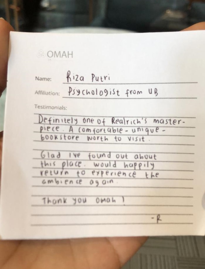 Definitely one of Realrich’s master piece. A comfortable-unique-bookstore worth to visit. Glad I’ve found out about this place. Would happily return to experience the ambience again. Thank you OMAH!