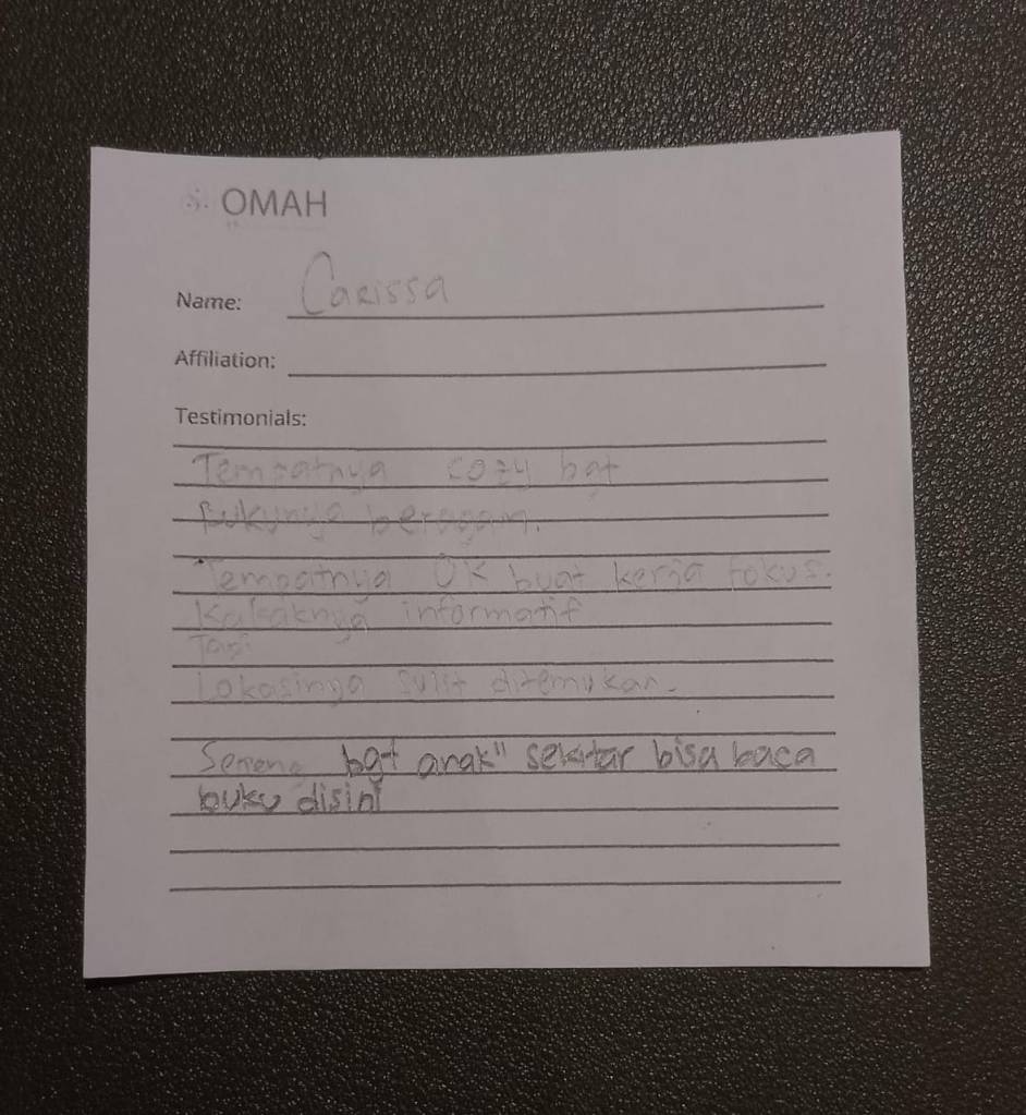Tempatnya cozy banget, bukunya beragam. Tempatnya oke buat kerja fokus, kakaknya informatif tapi lokasinya sulit ditemukan. Senang banget anak-anak sekitar bisa baca buku di sini.