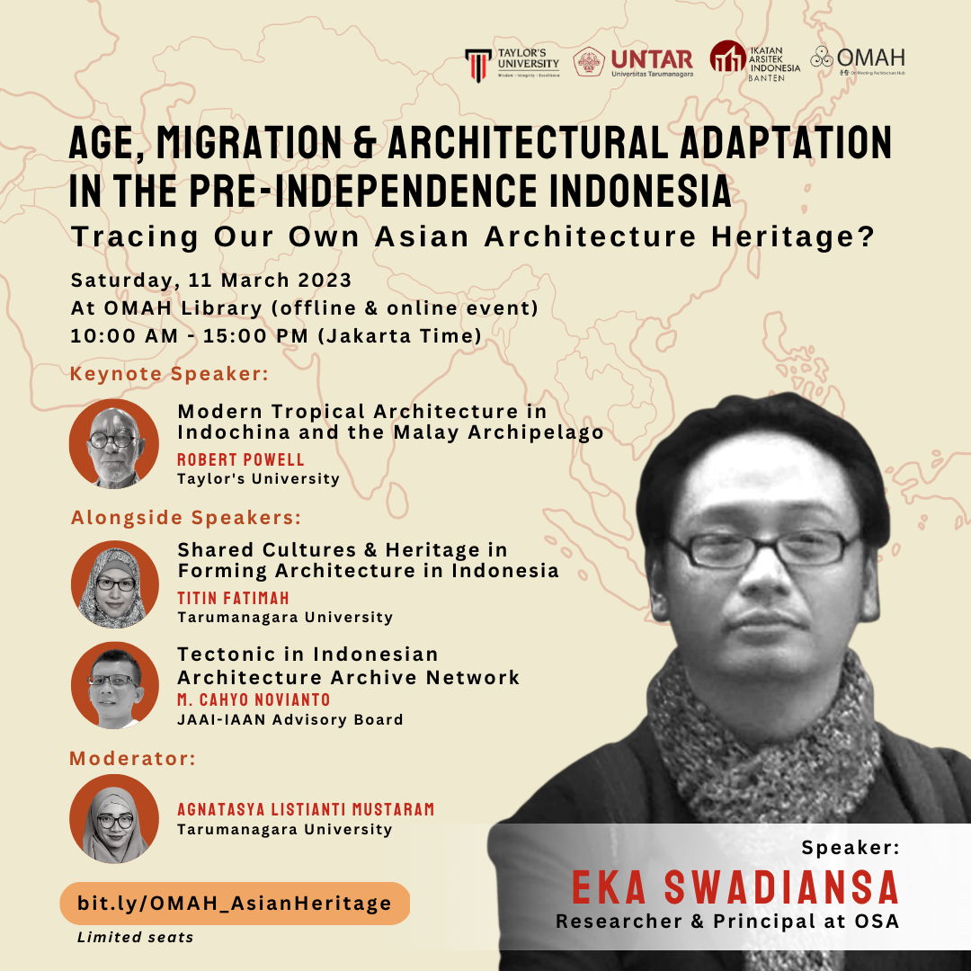 Dalam Seminar yang berjudul “Tracing Our Own Asian Architecture Heritage?”, OMAH Library bekerja sama dengan Taylor University, Universitas Tarumanagara, dan IAI Banten mengundang pemateri dari berbagai macam latar belakang, seperti praktisi – akademis, global – lokal untuk menelusuri ulang nilai-nilai Heritage/Pusaka yang sudah ada di Indonesia dan terus bertransformasi.