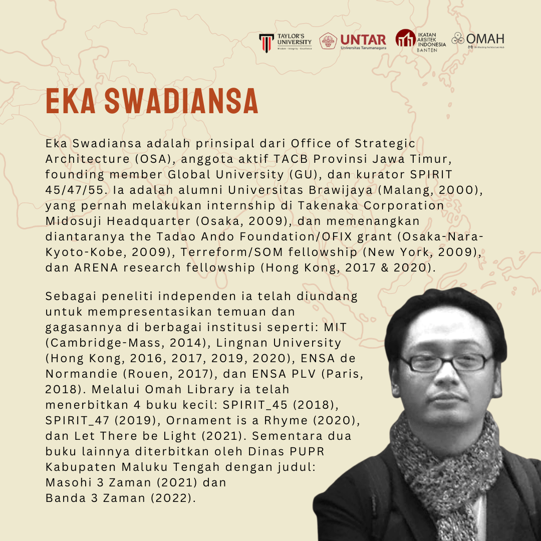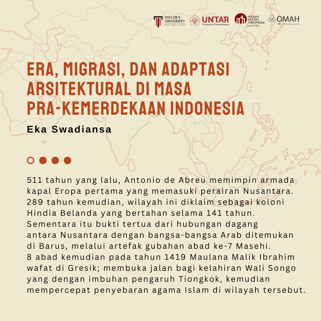 Materi dari Eka yang bertajuk “Age, Migration & Architectural Adaptation in the Pre-Independence Indonesia” ini akan dibawakan pada: