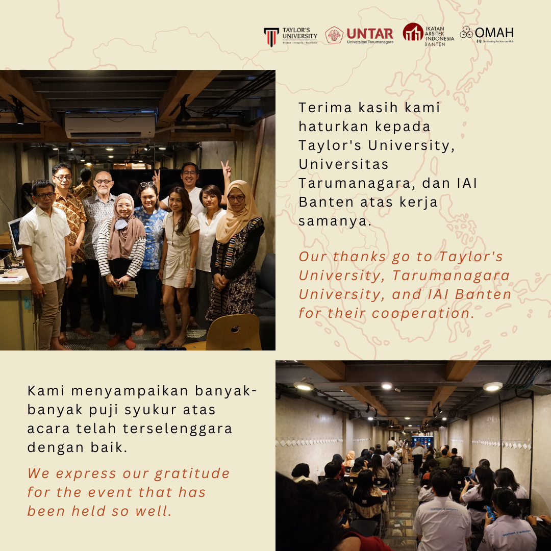 Our thanks go to Taylor’s University, Tarumanagara University, and IAI Banten for their cooperation. We express our gratitude for the event that has been held so well. This event had become a kind of reunion for those who haven’t seen each other for a long time, as well as a moment that introduced us to new people. The interactions that occur provide energy and can open doors of new opportunities. We look forward to the next collaboration!