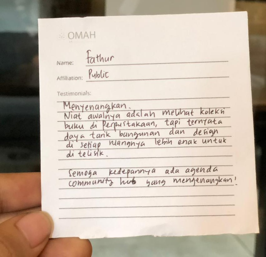 Menyenangkan. Niat awalnya adalah melihat koleksi buku di perpustakaan, tapi ternyata daya tarik bangunannya dan desain di setiap ruangnya lebih enak untuk di telisik. Semoga kedepannya ada agenda community hub yang menyenangkan!