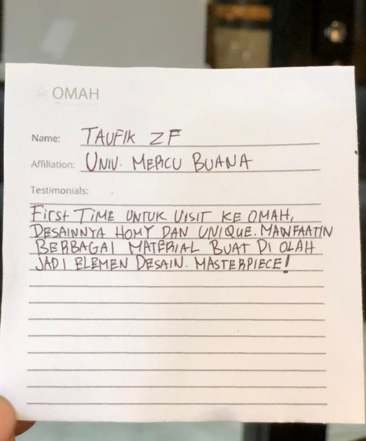 First time untuk visit ke OMAH, desainnya homey dan unique, manffatin berbagai macam material buat di olah jadi elemen desain. Masterpiece!
