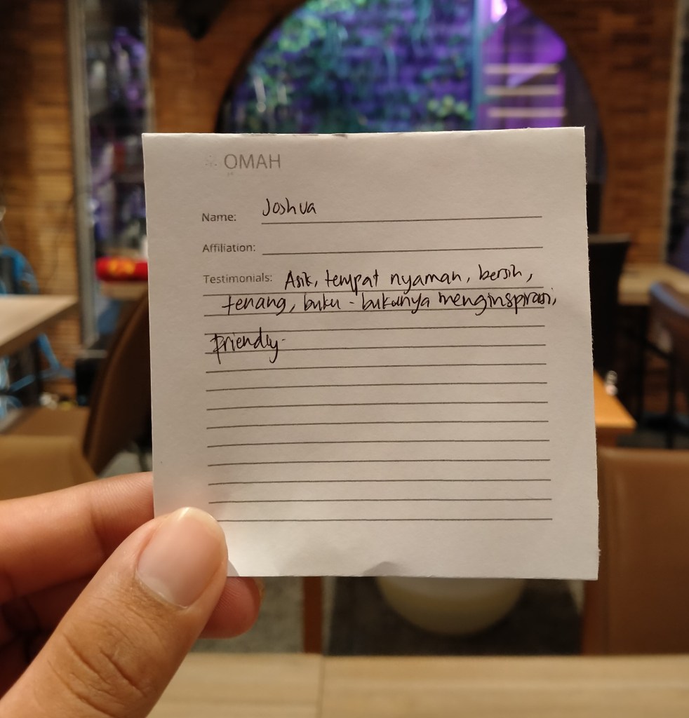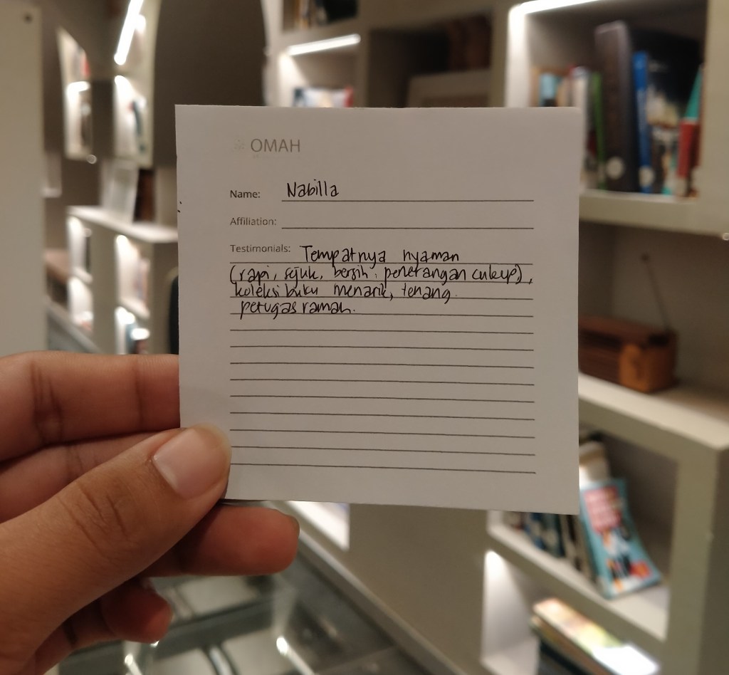 Asik, tempatnya nyaman, bersih, tenang, buku-bukunya menginspirasi, friendly.