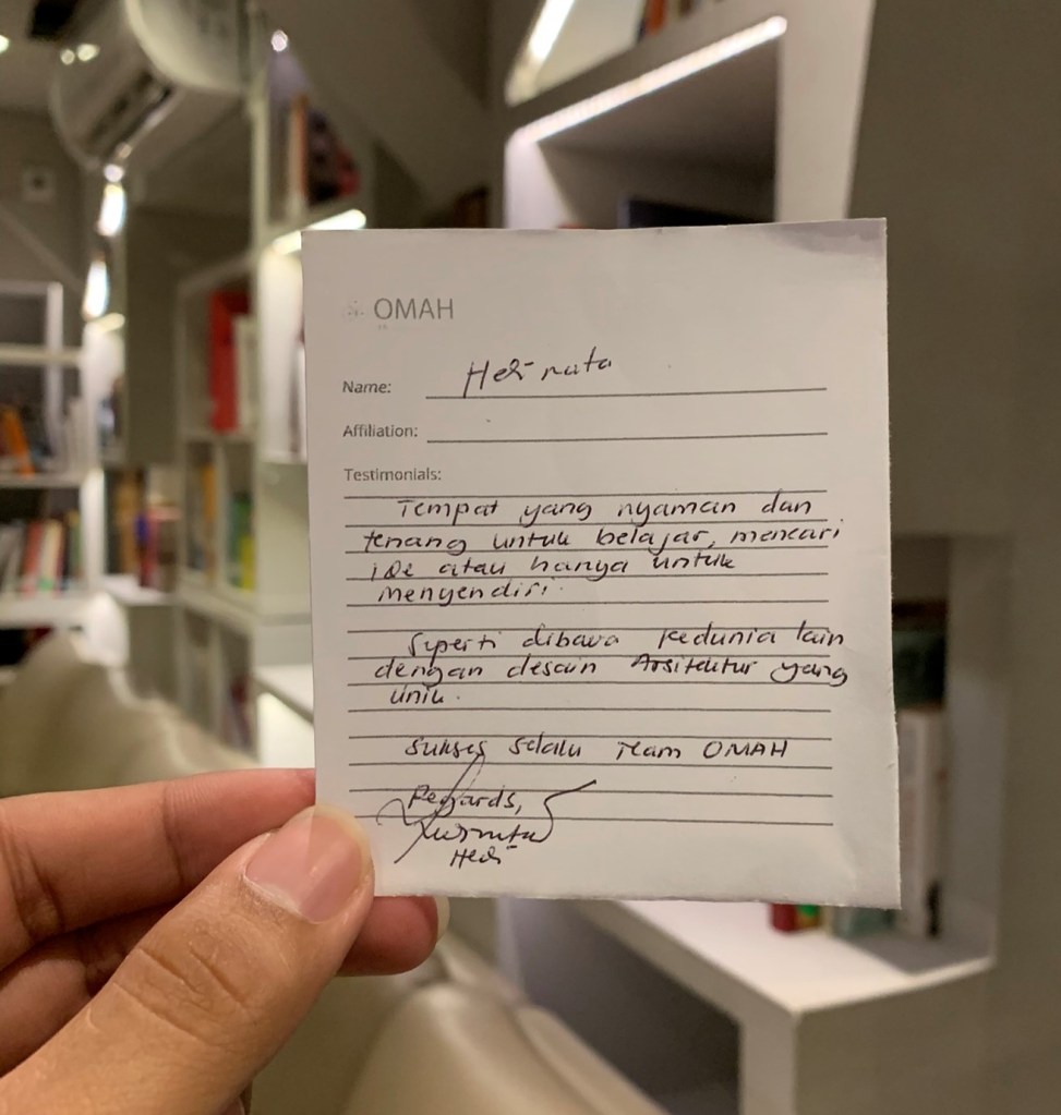 Tempat yang nyaman dan tenang untuk belajar, mencari ide atau hanya untuk menyendiri. Seperti dibawa kedunia lain dengan desain arsitektur yang unik. Sukses selalu team OMAH.