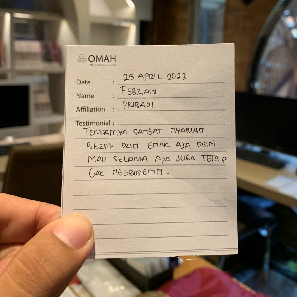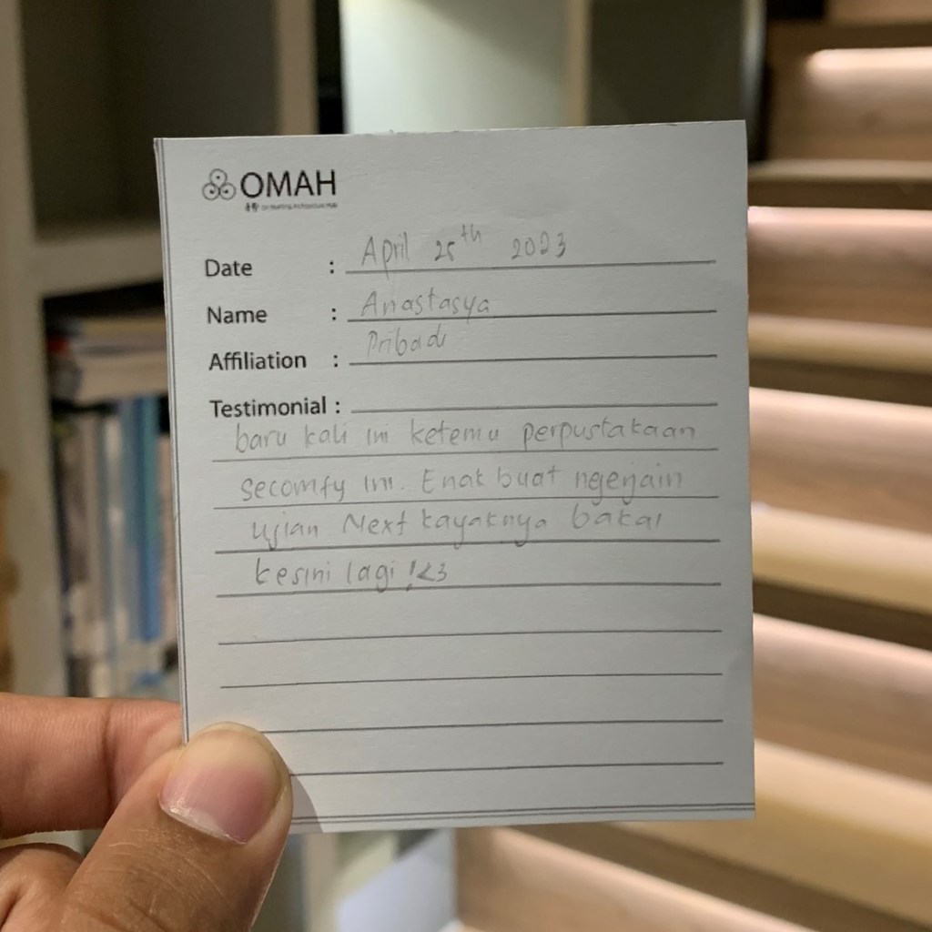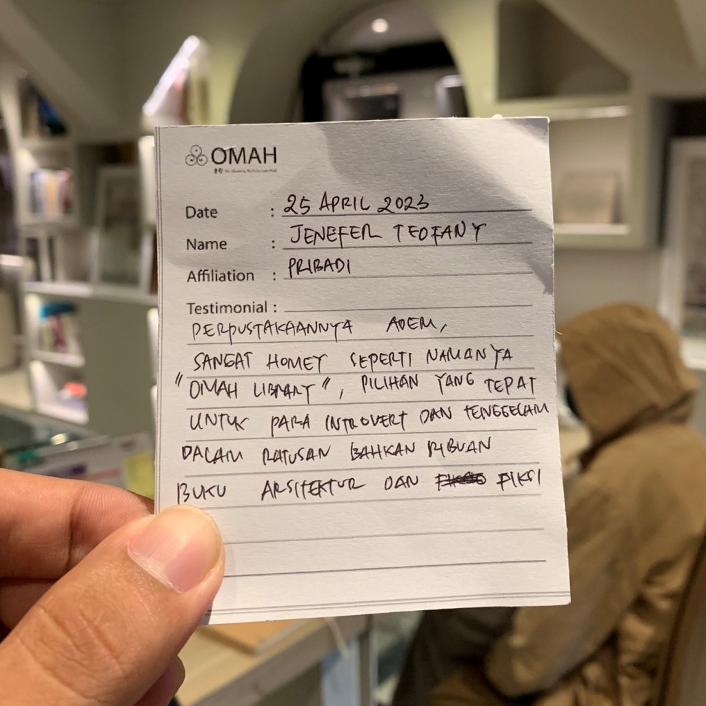 Perpustakannya adem, sangat homey seperti namanya “OMAH Library” Pilihan yang tepat untuk para introvert dan tenggelam dalam ratusan bahkan ribuan buku arsitektur dan fiksi.