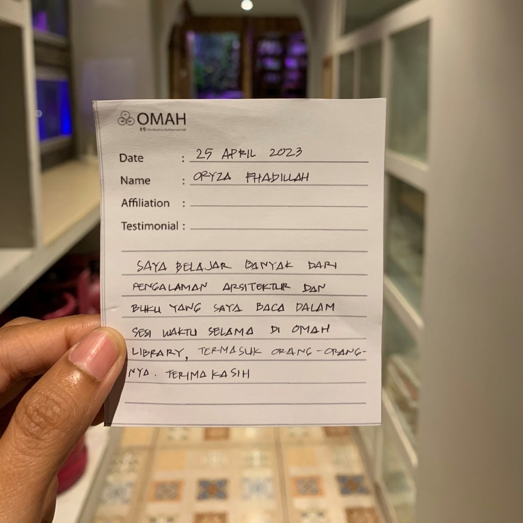 saya belajar banyak dari pengalaman arsitektur dan buku yang saya baca dalam sesi waktu selama di OMAH Library, termaksud orang-orangnya. Terima kasih
