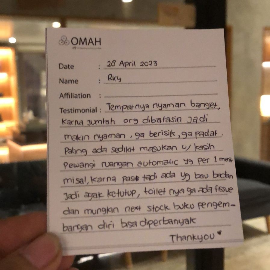 Tempatnya nyaman banget, karena jumlah orang dibatasin jadi makin nyaman, ga berisik, ga padat. Paling ada sedikit masukan untuk kasih pewangi ruangan automatic yang per 1 menit misal, karena pasti tadi ada yang bau badan jadi agak ketutup, toiletnya ga ada tissue dan mungkin next stock buku pengembangan diri bisa diperbanyak Thank you.