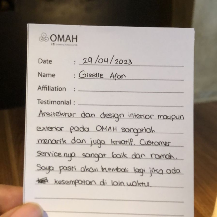 Arsitektur dan design interior maupun exterior pada OMAH sangatlah menarik dan juga kreatif. Customer servicenya sangat baik dan ramah. Saya pasti akan kembali lagi jika ada kesempatan di lain waktu.