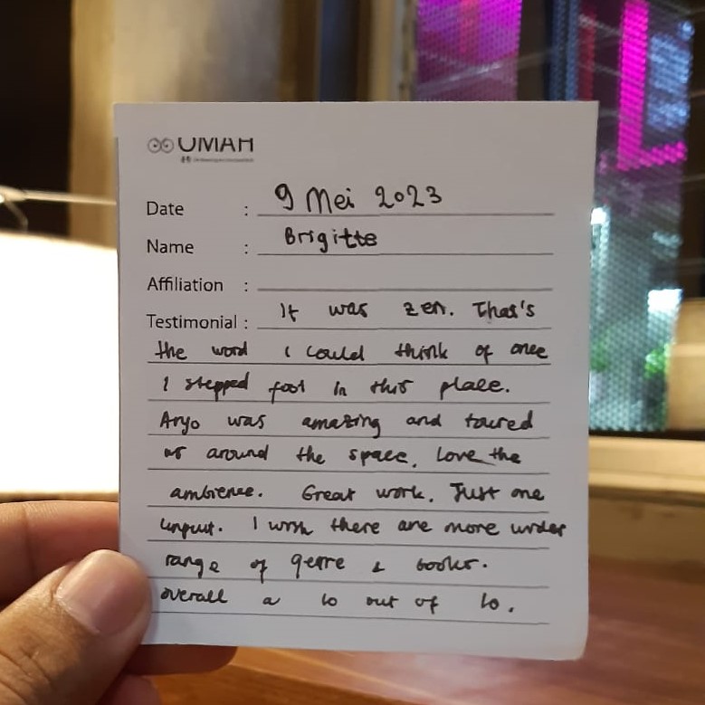It was zen. That’s the word i could think of once i stepped foot in this place. Aryo was amazing and toured us around the space. Love the ambience. Greate work. Just one inpus, i wish there one more wider range of genre & books. Overall a 10 out of 10