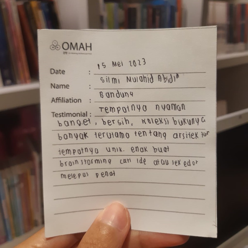 Tempatnya nyaman banget, bersih, koleksi bukunya banyak terutama tentang arsitektur. Tempatnya unik enak buat brain storming cari ide atau sekedar melepas penat