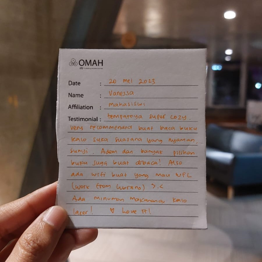 Tempatnya super cozy. Very recommended buat baca buku kalo suka suasana yang nyaman, sunyi. Adem dan banyak pilihan buku juga buat dibaca! Also ada wifi buat yang mau WFL (Work from Library) >,< Ada minuman makanan kalo laper! ❤ Love it!