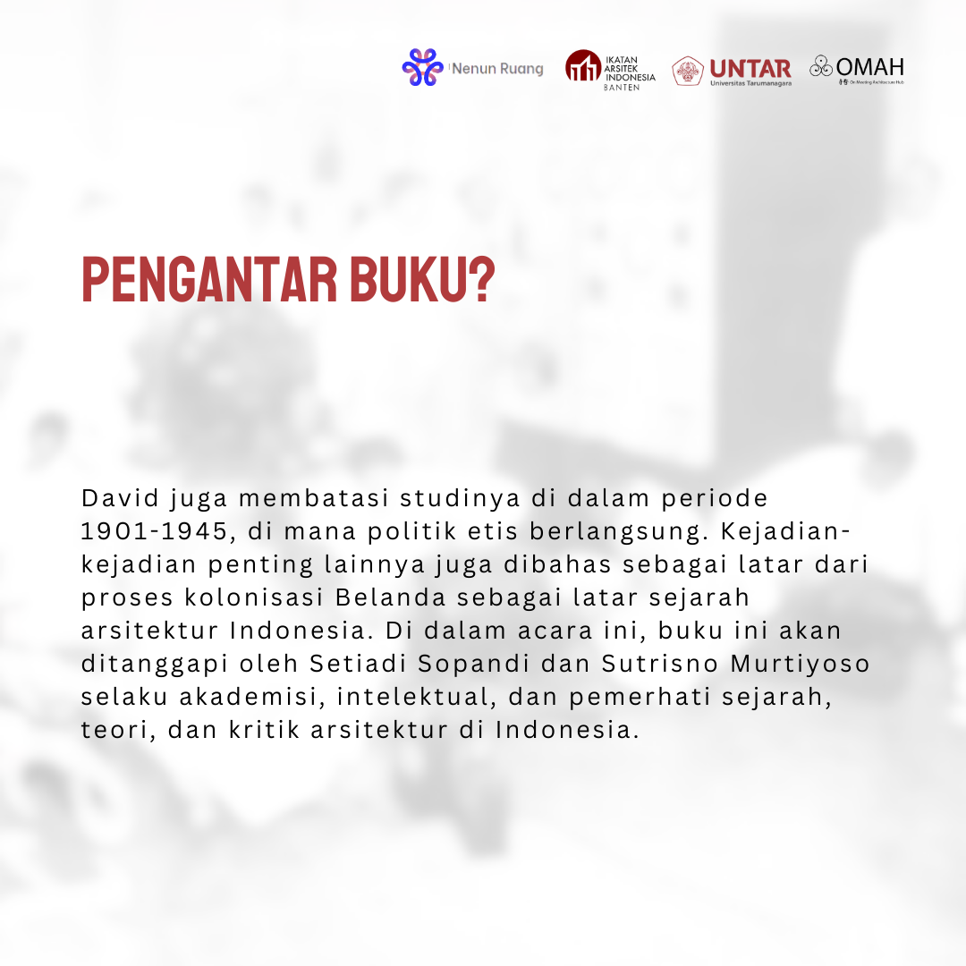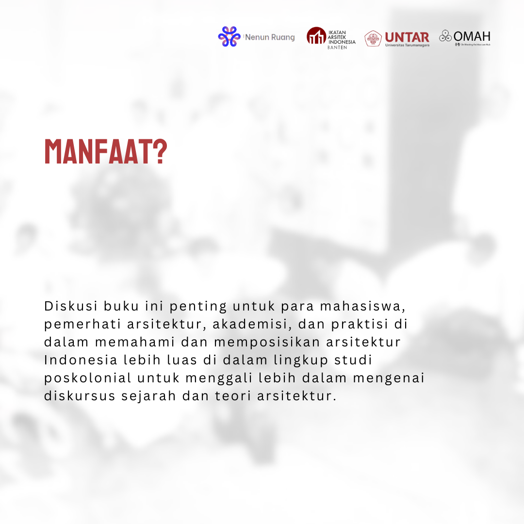 Buku ini akan ditanggapi oleh Setiadi Sopandi & Sutrisno Murtiyoso selaku akademisi, intelektual, dan pemerhati sejarah-teori-kritik arsitektur di Indonesia. Acara ini penting bagi mahasiswa, pemerhati arsitektur, akademisi, dan praktisi dalam memposisikan arsitektur Indonesia pada studi poskolonial untuk menggali diskursus sejarah & teori arsitektur lebih dalam.