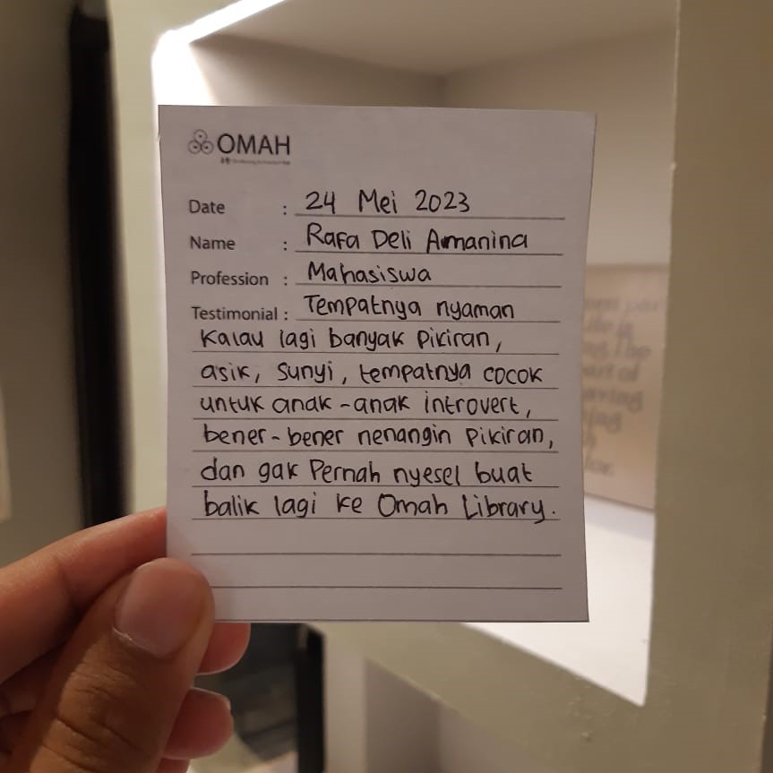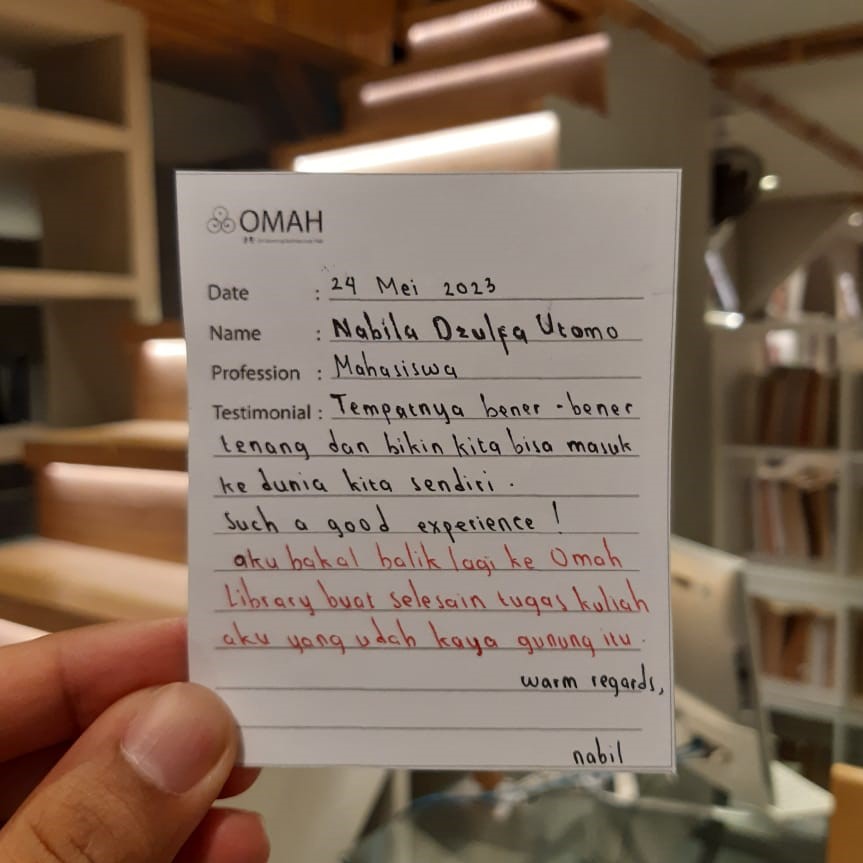 Tempatnya bener-bener tenang dan bikin kita bisa masuk ke dunia kita sendiri. Such a good experience! Aku bakal balik lagi ke OMAH Library buat selesaiin tugas kuliah aku yang udah kayak gunung itu. Warm regards, Nabil.