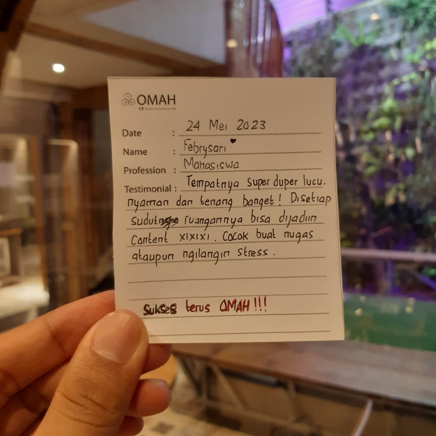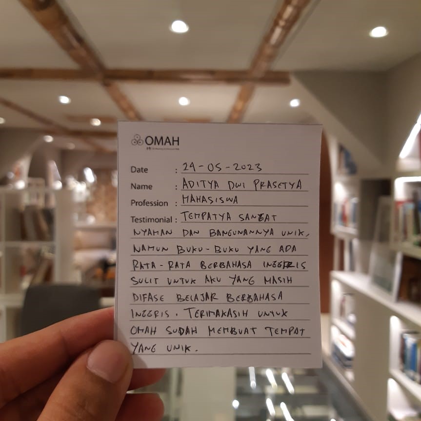 Tempatnya sangat nyaman dan bangunannya unik, namun buku-buku yang ada rata-rata berbahasa Inggris sulit untuk aku yang masih di fase belajar Bahasa Inggris. Terima kasih untuk OMAH sudah membuat tempat yang unik.