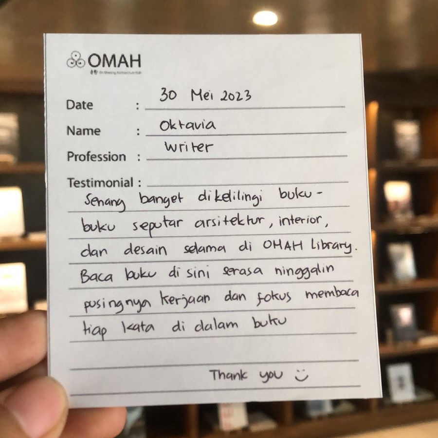 Senang banget dikelilingi buku-buku seputar arsitektur, interior, dan desain selama di OMAH Library. Baca buku disini serasa ninggalin pusingnya kerjaan dan fokus membaca tiap kata didalam buku. Thank you.
