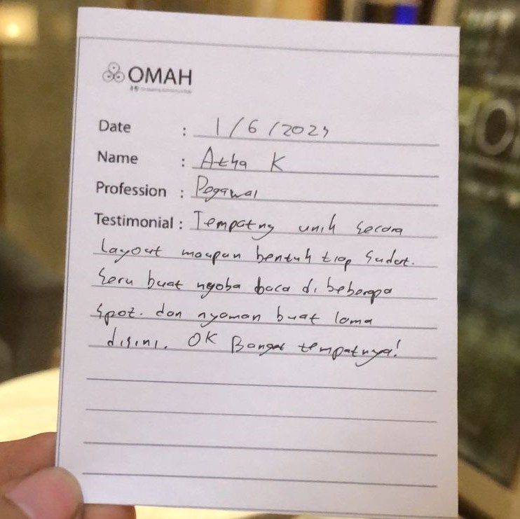 Tempatnya unik secara layout maupun bentuk setiap sudut buat nyoba baca di beberapa spot dna nyaman buat loma disini. Ok banget tempatnya