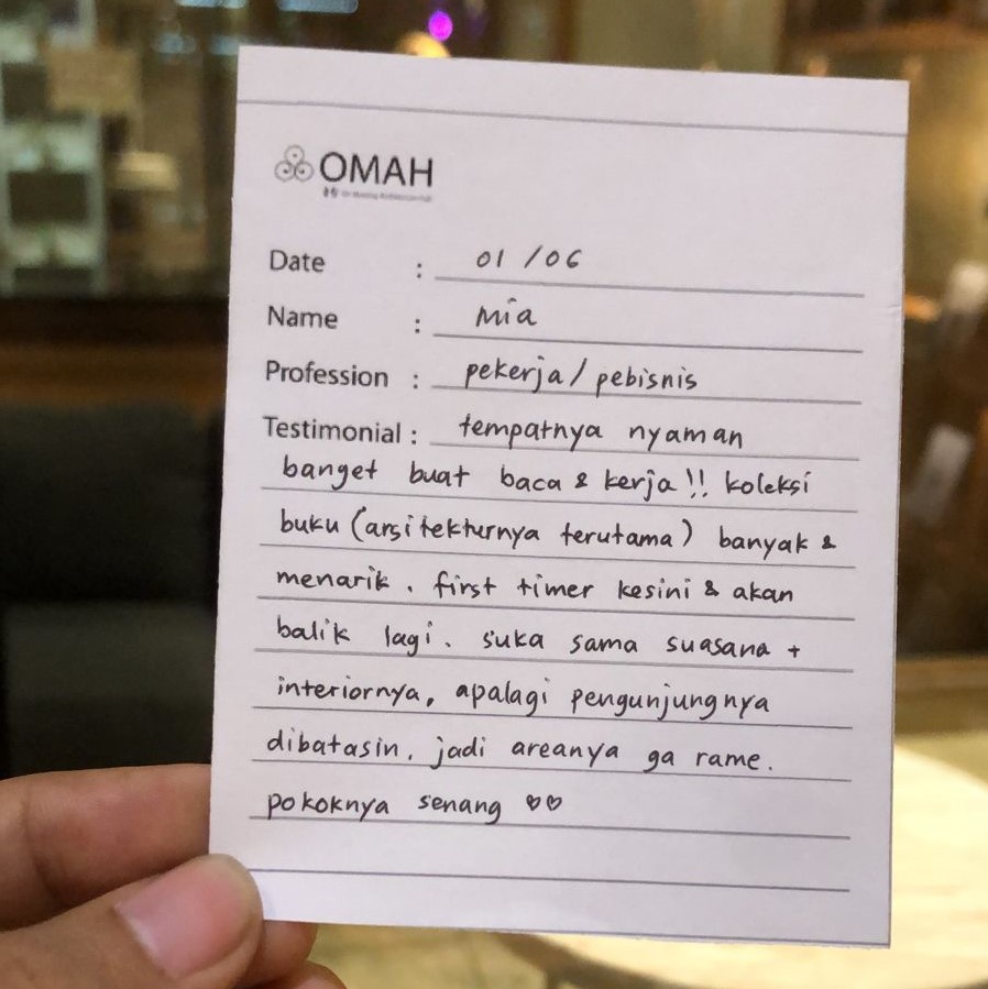 Tempatnya nyaman banget buat baca & kerja !! Koleksi buku (arsitekturnya terutama) banyak yang menarik , first timer kesini & akan balik lagi, suka sama suasana, interiornya, apalagi pengunjungnya dibatasi, jadi arenya ga rame. Pokoknya senang ❤ ❤