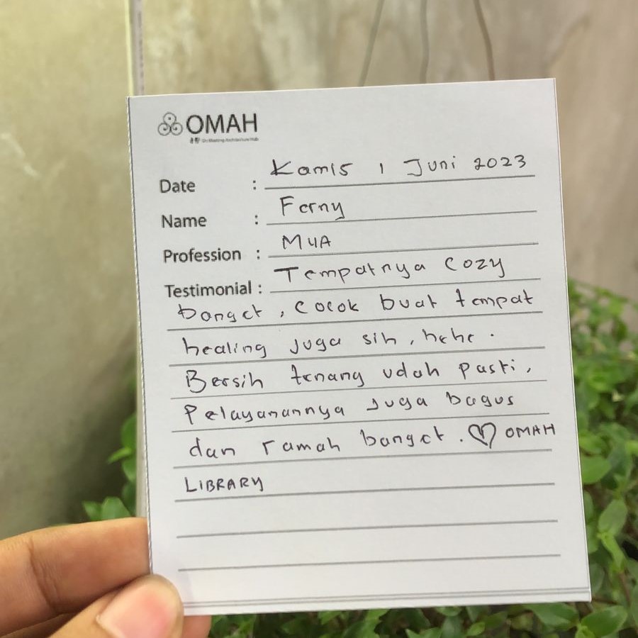 Tempatnya cozy bangey, cocok buat tempat healing juga sih , he he. bersih tenang udha pasti pelayanannya juga bagus dan rama baget ❤ OMAH libary