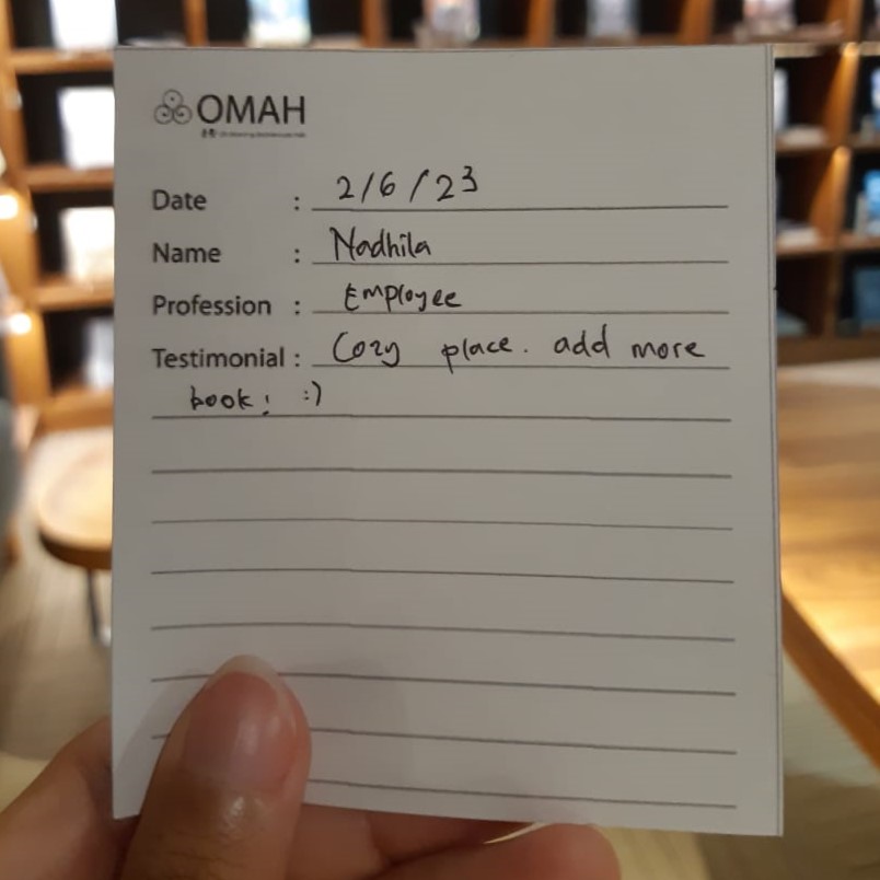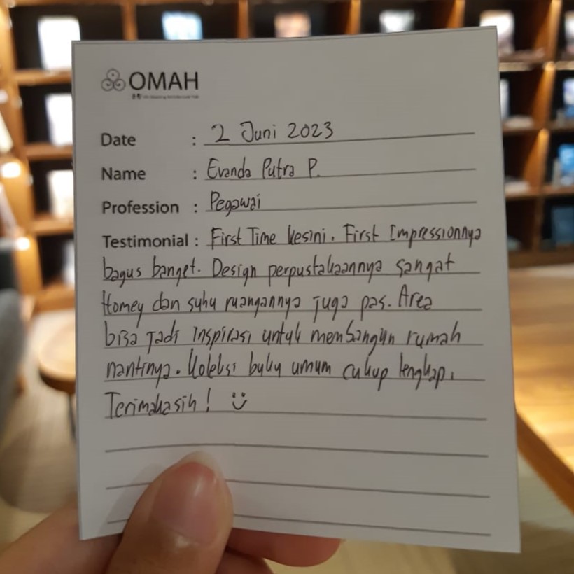First time ke sini. First impression-nya bagus banget. Desain perpustakaannya sangat homey dan suhu ruangannya juga pas. Area bisa jadi inspirasi untuk membangun rumah nantinya. Koleksi buku umum cukup lengkap. Terima kasih! 🙂