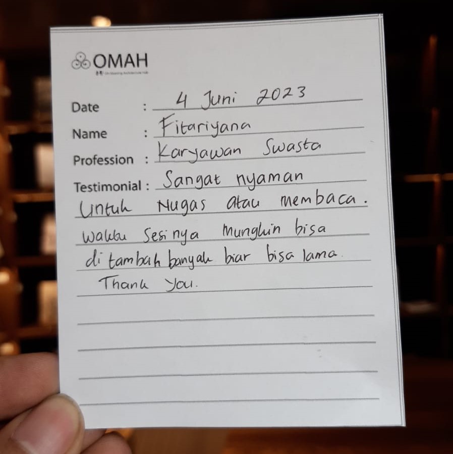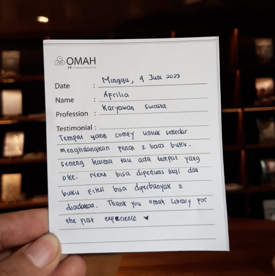 Tempat yang comfy untuk sekedar menghilangkan penat dan baca buku. Senang karena tau ada tempat yang oke. Next bisa diperluas lagi dan buku fiksi bisa diperbanyak dan diadakan. Thank you Omah Library for the first experience.