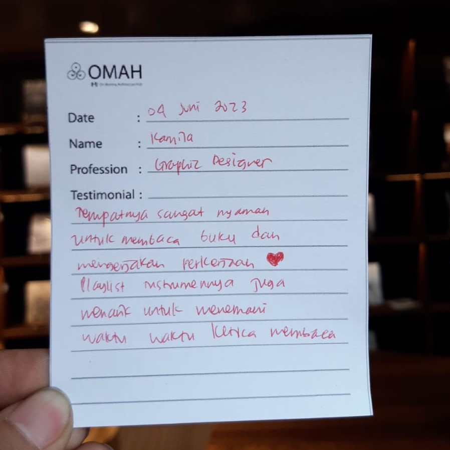2 jam di Omah Library membuat saya seperti berada di dunia yang berbeda. Suasana nya membuat saya lebih fokus. Arsitektur jadi begitu menarik, saya ingin kembali, ingin membaca buku-buku yang ada sambil menikmati seluruh ruangannya yang unik. Sangat menginspirasi! Sukses selalu ya.