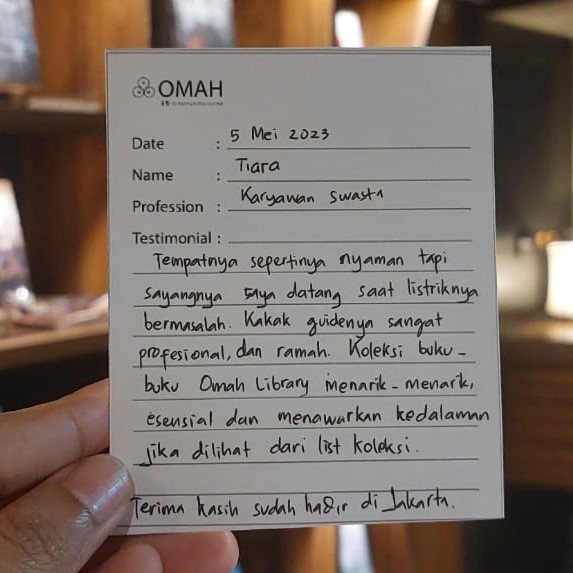 Tempatnya sepertinya nyaman tapi sayangnya saya datang saat listriknya bermasalah. Kakak guide-nya sangat profesional dan ramah. Koleksi buku-buku Omah Library menarik-menarik, esensial dan menawarkan kedalaman jika diliat dari list koleksi. Terima kasih sudah hadir