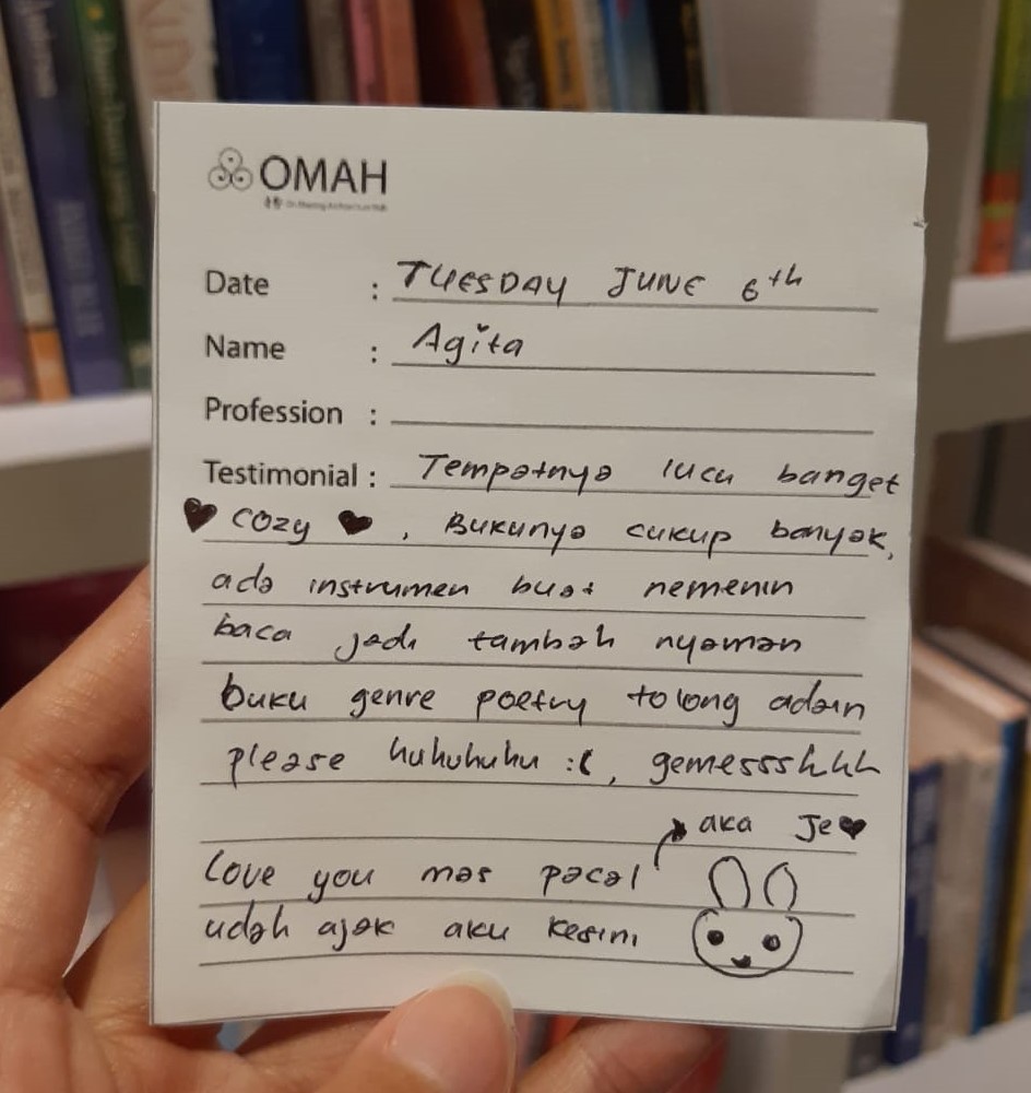 Tempatnya lucu banget. Cozy, bukunya cukup banyak, ada instrumen buat nemenin baca jadi tambah nyaman. Buku genre poetry to long adain please huhuhu 😦 gemessshhh. Love you mas pacar -> aka je udah ajak aku ke sini 🙂