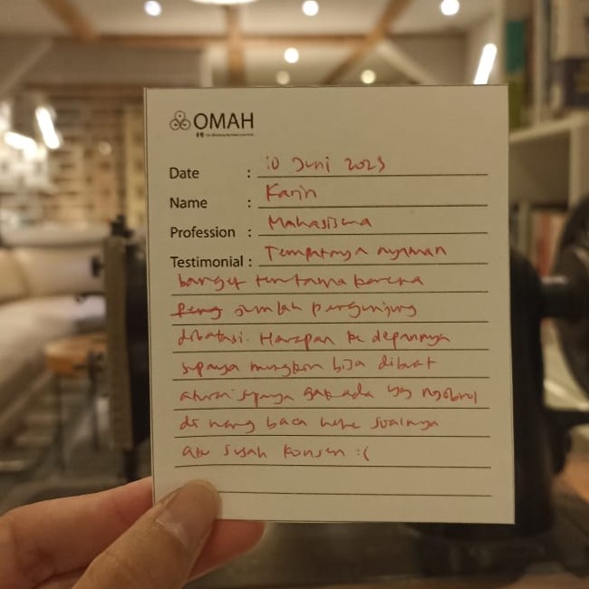 Tempatnya nyaman banget terutama karena jumlah pengunjung dibatasi. Harapan kedepannya bisa dibuat aturan supaya gak ada yang ngobrol di ruang baca hehe soalnya aku susah konsen:(