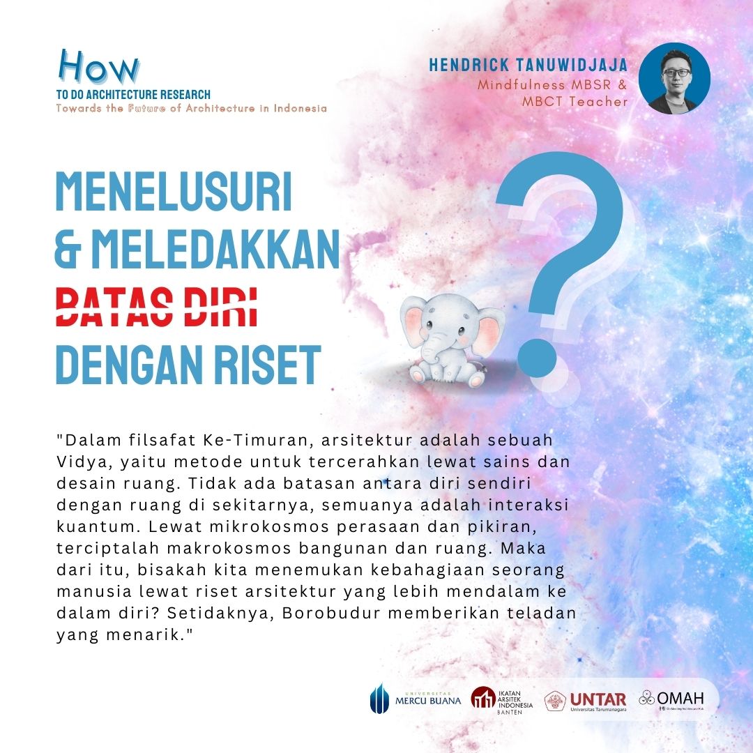 Hendrick Tanuwidjaja akan mengulik paparan tentang Menelusuri & Meledakkan Batas Diri dengan Riset. Menurut beliau dalam filsafat Ke-Timuran, arsitektur adalah sebuah Vidya, yaitu metode untuk tercerahkan lewat sains dan desain ruang. Tidak ada batasan antara diri sendiri dengan ruang di sekitarnya, semuanya adalah interaksi kuantum. Lewat mikrokosmos perasaan dan pikiran, terciptalah makrokosmos bangunan dan ruang. Maka dari itu, bisakah kita menemukan kebahagiaan seorang manusia lewat riset arsitektur yang lebih mendalam ke dalam diri? Setidaknya, Borobudur memberikan teladan yang menarik.