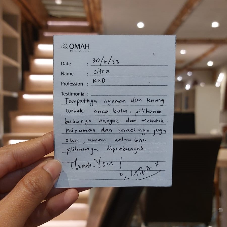 Tempatnya nyaman dan tenang untuk baca buku, pilihan bukunya banyak dan snack-nya juga oke, aman. Kalau bisa pilihannya diperbanyak. Thank you!