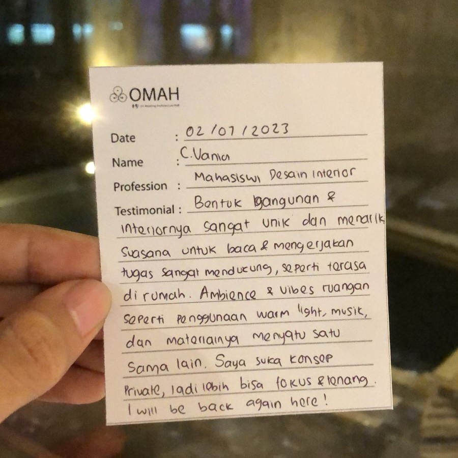 Bentuk bangunan & interior-nya sangat unik dan menarik suasana untuk baca & mengerjakan tugas sangat mendukung, seperti terasa di rumah. Ambience & vibes ruangan seperti penggunaan warm light, musik, dan materialnya menyatu satu sama lain. Saya suka konsep private, jadi lebih bisa fokus & tenang. I will be back again here!
