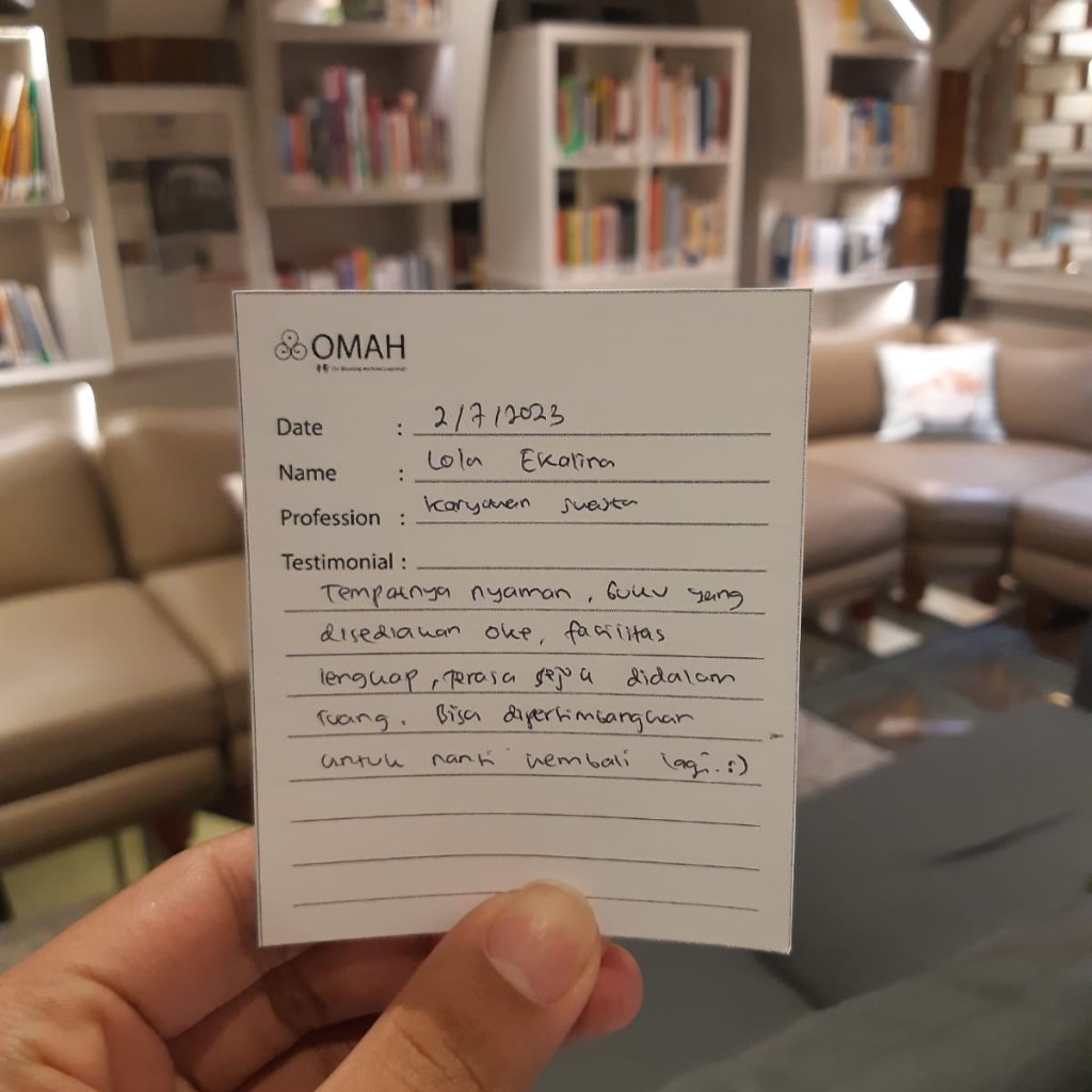 Tempatnya nyaman, buku yang disediakan oke, fasilitas lengkap, terasa sejuk di dalam ruang. Bisa dipertimbangkan untuk nanti kembli lagi:)
