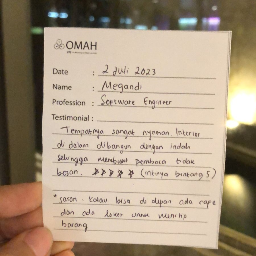 Tempatnya sangat nyaman. Interior di dalam dibangun dengan indah sehingga membuat pembaca tidak bosan. (intinya bintang 5) Saran : kalau bisa di depan ada cafe dan ada loker untuk menitip barang.