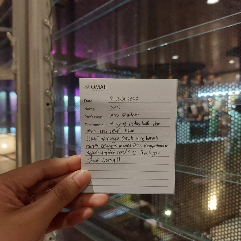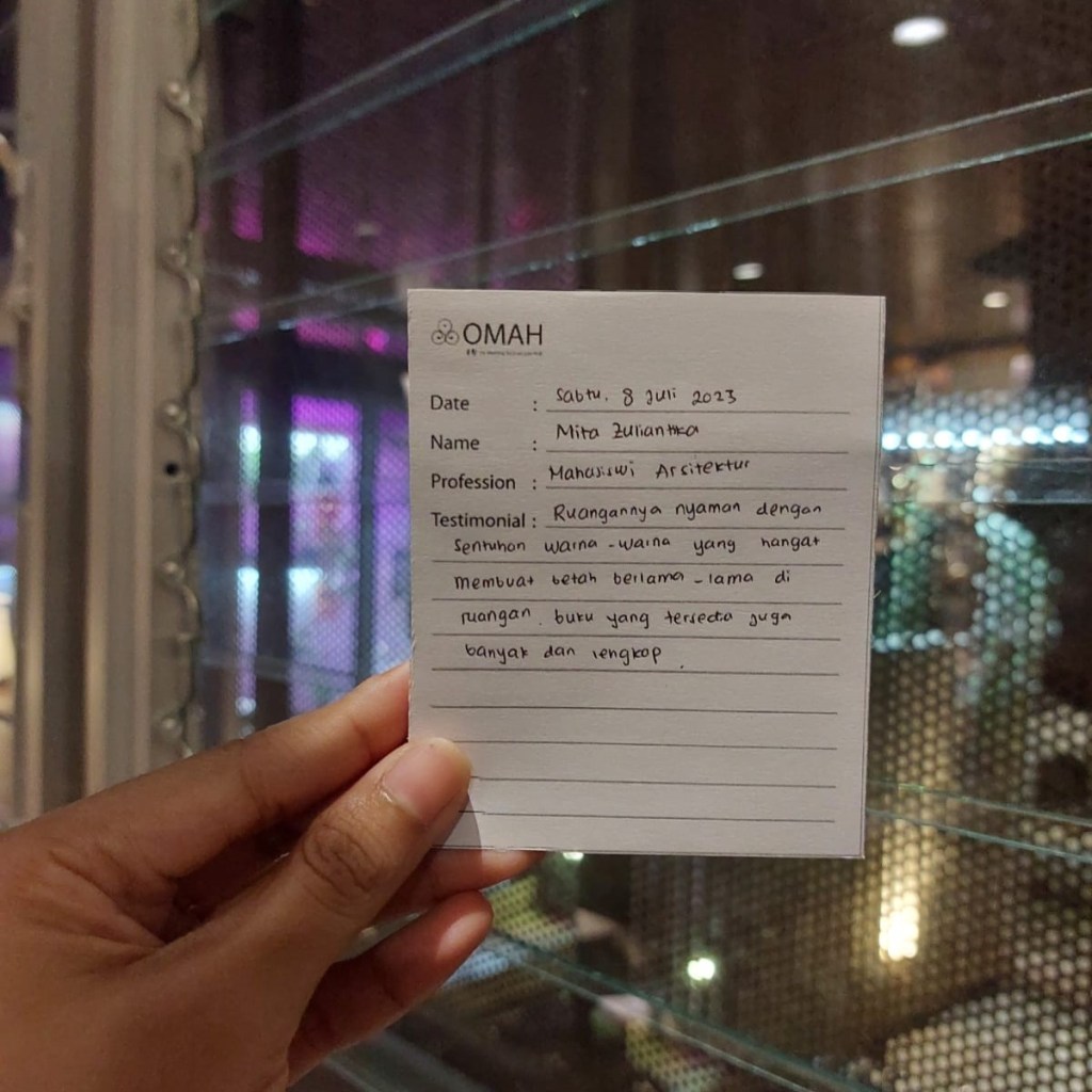 Ini yang kedua kali, dan akan terus kesini…hehehe Sesuai namanya OMAH yang berarti rumah sehingga memberikan kenyamanan seperti dirumah sendiri Thank you Omah Library.