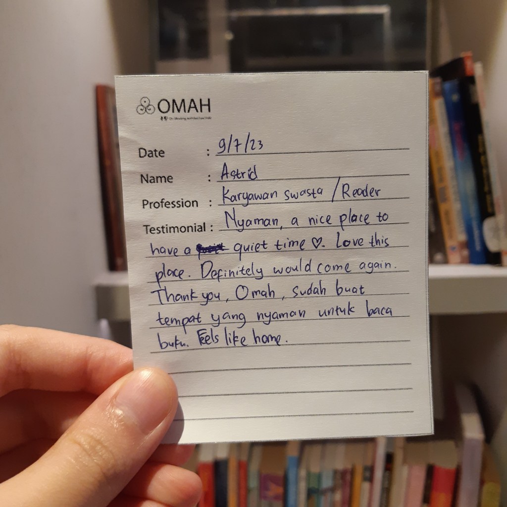 Nyaman, a nice place to have a quiet time <3. Love this place. Definitely would come again. Thank you OMAH, sudah buat tempat yang nyaman untuk baca buku. Feel like home.