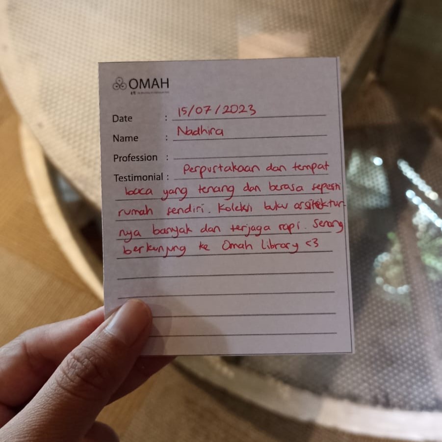 Perpustakaan dan tempat baca yang tenang dan berasa seperti rumah sendiri. Koleksi buku arsiktekturnya banyak terjaga rapi. Senang berkunjung ke OMAH libary. ❤
