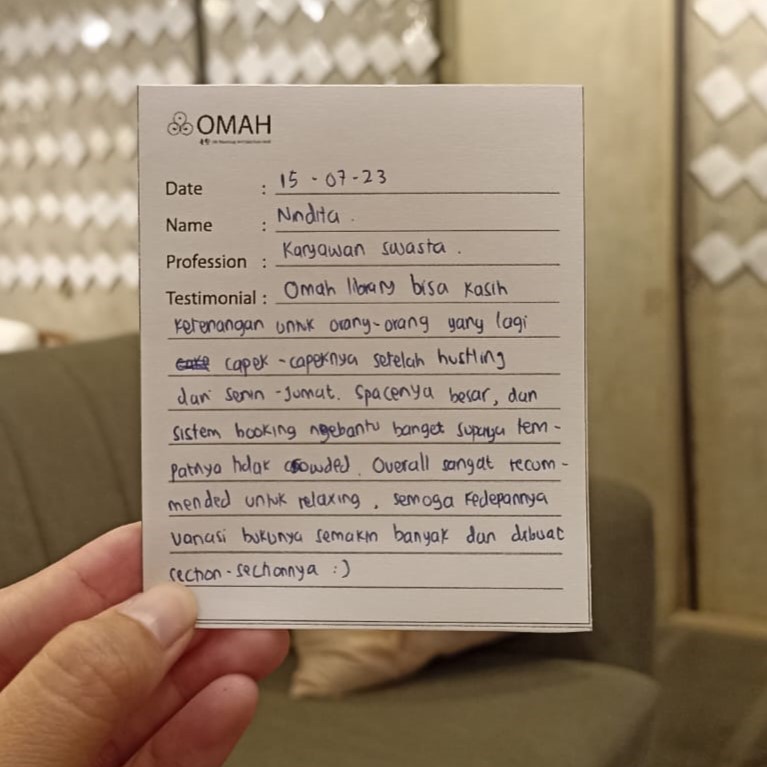 Omah Libary bisa kasih ketenangan untuk orang-orang yang lagi capek-capeknya setelah hustling dari senin – jumat. Space-nya besar dan sistem booking membantu banget supaya tempatnya tidak crowded. Overall sangat recommended untuk relaxing. Semoga kedepannya variasi bukunya semakin banyak dan dibuat section-section-nya:)