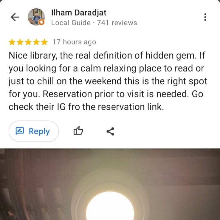 Nice library, the real definitionof hidden gem. If you looking for a calm relaxing place to read or just to chill on the weekend prior to visit is needed. Go check their IG for the reservation link.