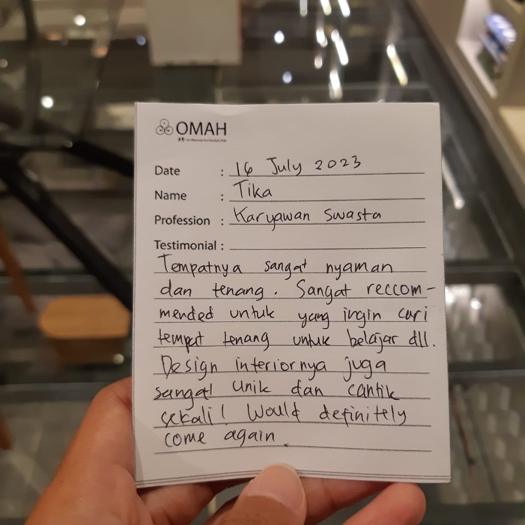 Tempatnya sangat nyaman dan tenang, sangat recommended untuk yang ingin cari tempat yang tenang untuk belajar dll. Design interiornya juga sangat unik dan cantik sekali! Would definitely come again.